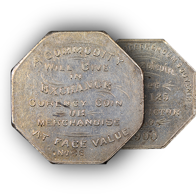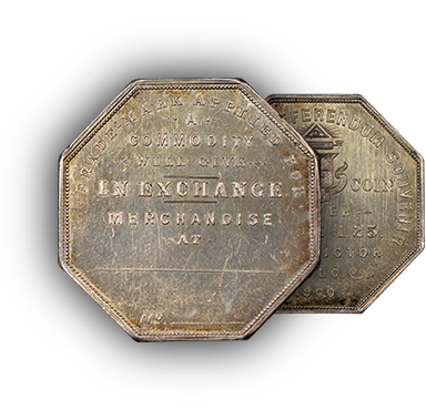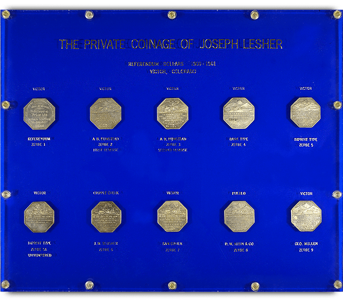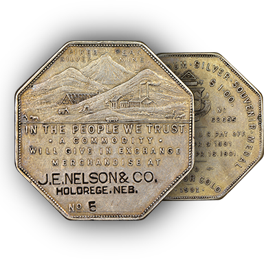 The 20 medals in the Henderson-Marchase Collection constitute the most complete set of Lesher “Referendum Dollars,” which were minted in 1900 and 1901 by silver mine entrepreneur Joseph Lesher of Victor, Colorado. Pieces dated 1900 bear a $1.25 price and those dated 1901 bear a $1 price. This was significantly higher than their silver value, which was suffering at the time, so it was up to the public to decide whether to accept them. All are octagonal with a plain edge and bear Lesher’s name and city, which is near the Pikes Peak Silver Mine pictured on most of the Lesher Referendum Dollars.